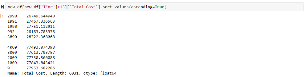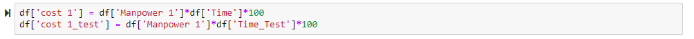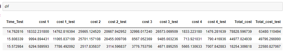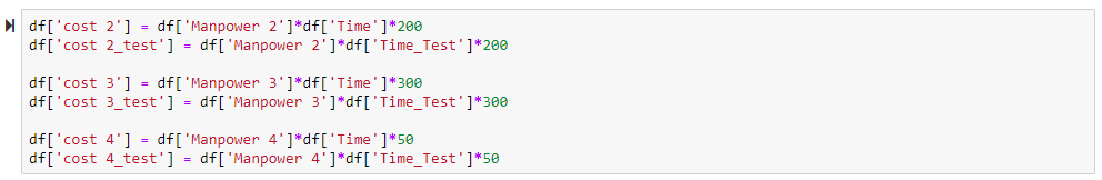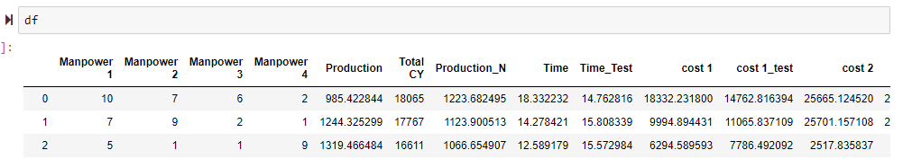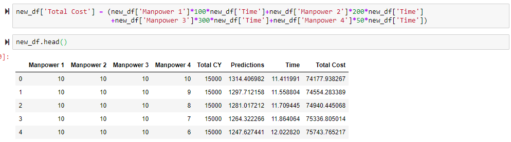 Total cost was then calculated and also added to the data frame to see how the price compared for each example project. As you would imagine, the lowest cost to complete this work would be to use 1 worker for each of the manpower columns (4 workers total). This would be the lowest cost, but would also take the longest time. Realistically, a specified duration needs to be decided on, and after that, the most cost effective combination of manpower to complete the project in that duration can be found.