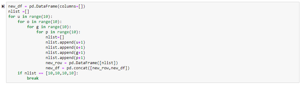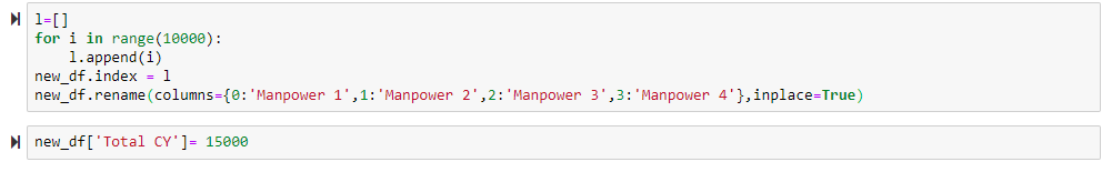 This project consisted of four different manpower options (manpower 1, 2, 3, and 4). Each of these varied in amounts of people from 1 person up to 10 people. To begin in this step of the analysis, data for all combinations of manpower needed to be created. This code shows the process for creating all possible manpower combinations.