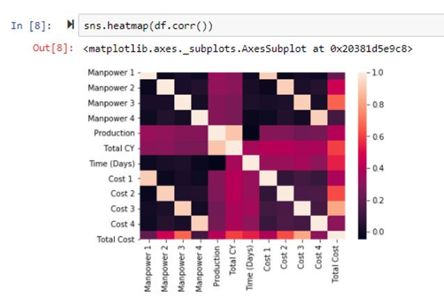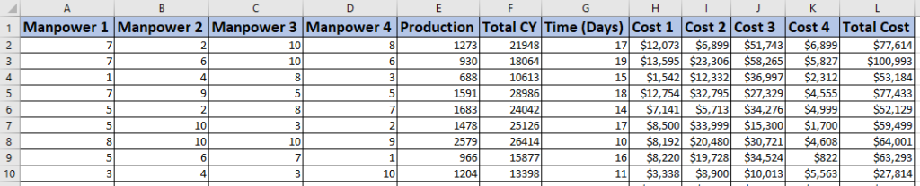Before approaching companies for their proprietary data, the project needed to have a proof of concept. To obtain this proof of concept, a randomized data set was created. The head of the data set is shown in this table. Each row of data represents a completely unique similar construction project with varying manpower, production, materials, costs etc. Each cell under manpower 1 through 4 columns generated a random number between 1 and 10 people (this was done in excel using the formula RANDBETWEEN(1,10) ). Since production depends on manpower, the production was calculated using the sum of randomized percentages of each of the man power cells (this was done using the excel formula 100*(A2*RAND()+B2*RAND()+C2*RAND()+D2*RAND()) ). To generate a randomized amount of work that needed to be complete (Total CY or cubic yards), a total cubic yardage was calculated by selecting a random amount between the production multiplied by ten and multiplied by 20 (this was done using the excel formula RANDBETWEEN(E2*10,E2*20) ). After this randomized data had been created, the time to complete the work was found by dividing the total cubic yardage by the production (F2/E2). The cost columns are directly related to the man power columns. For example, cost 1 is the total cost for the duration of the project for manpower 1. Each of the 4 manpower columns were arbitrarily assigned costs per day. See the list for costs per day per 1 man power amount. Cost 1, 2, 3, and 4 were all calculated by multiplying man power amount by cost per day by total time. For example cost 1 in row 2 was calculated in excel by 100*A2*G2. Once each of the individual costs were calculated, they were summed to get the total cost column.
