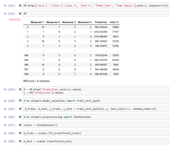 To prepare for the creation of the machine learning model, all of the columns were dropped off the dataset besides man power, production, and total CY. The columns manpower 1, 2, 3, 4, and total CY will be used to predict the overall production. When the data was cleaned and prepared, the data was split into training and testing data to train and create the model and then test the model.