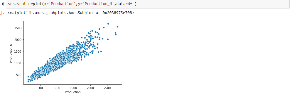 Once the predictions for all the production rates were added to the dataset, the predicted production rates were compared to the actual production rates using a scatterplot.